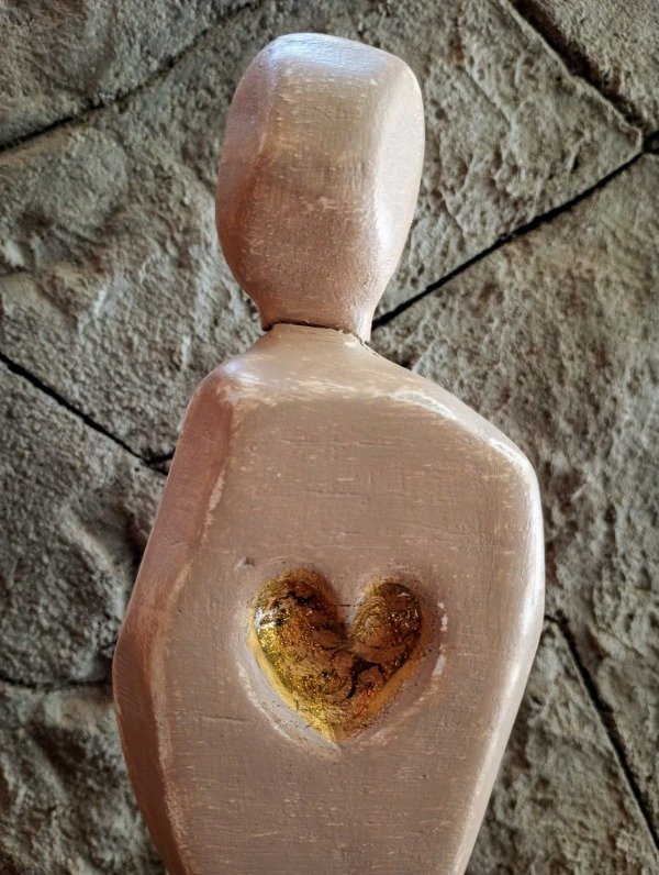 Con corazón pintado en colores dorados y verde.